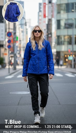 * テックウェアに: 黒いスラックスやタイトなパンツと合わせ、鮮やかなブルーを際立たせるモードな着こなし。